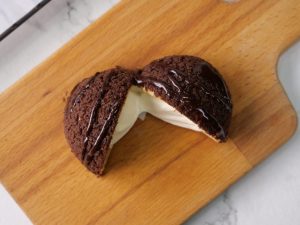 -Insert tip of custard cream filled bag into hole in each choux & begin piping with steady pressure until filled.