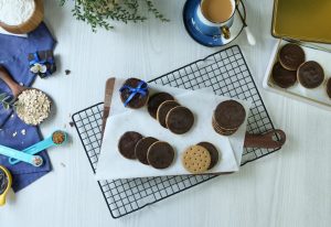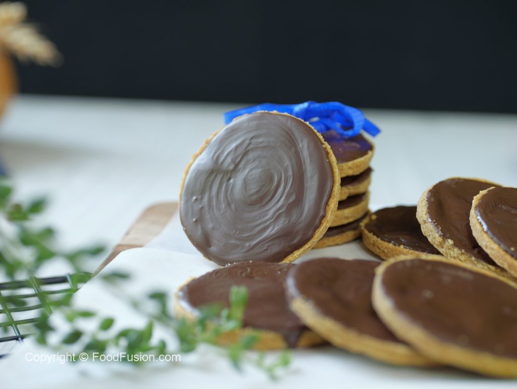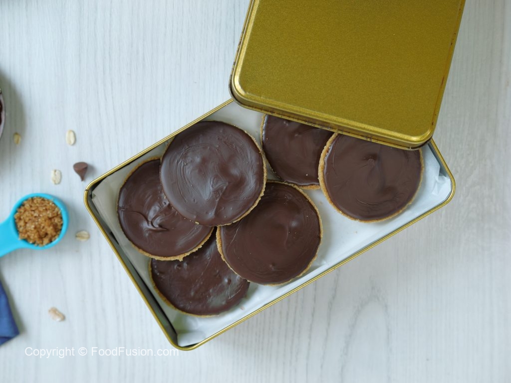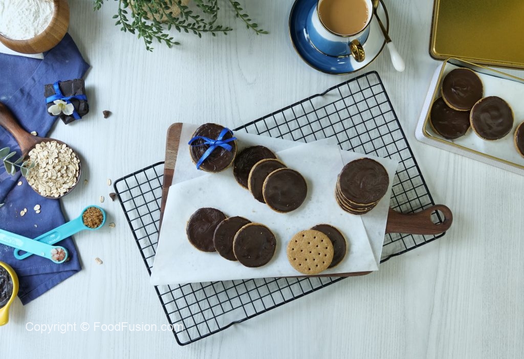 -Biscuits ki ek side per melted chocolate laga lein aur room temperature per set ho janay tak chor dein (makes 28).