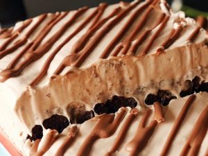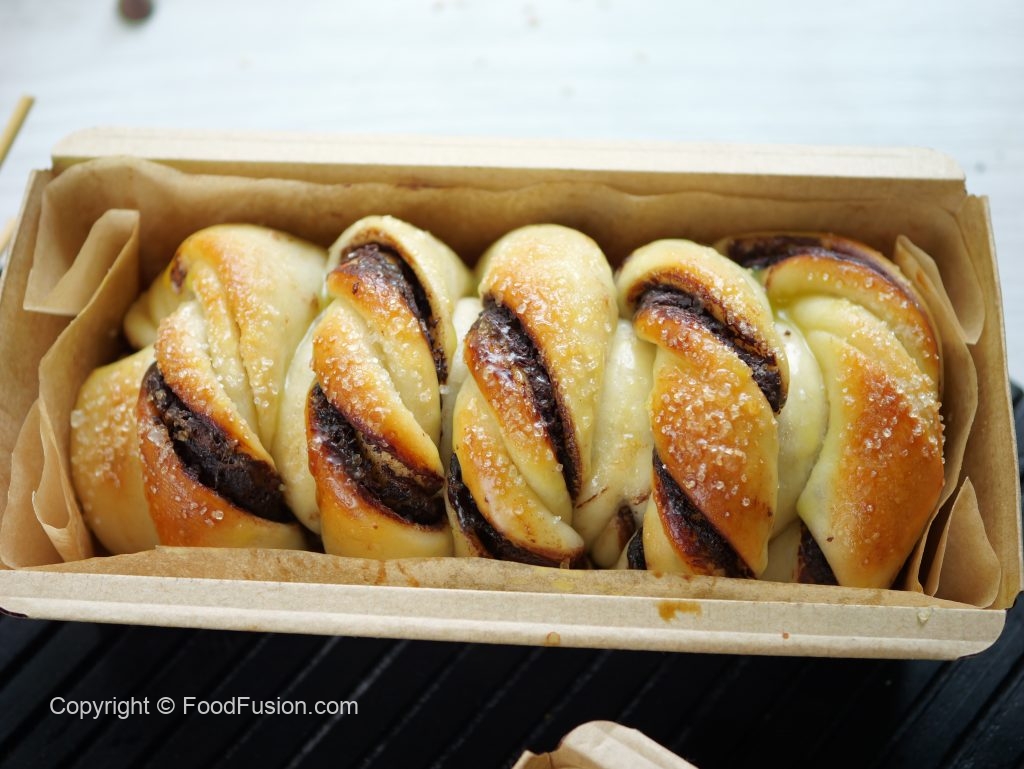 -Spread chocolate spread on rolled dough & flip one end over the other.
