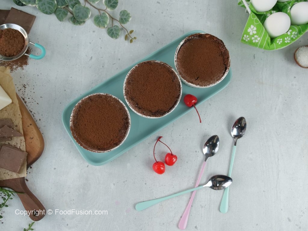 Place ramekins on a baking dish & bake in preheated oven at 200C for 15-16 minutes (makes 4).