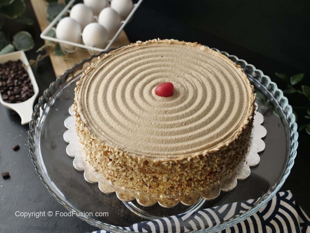 Cake stand per cake ki first layer rakh dein,coffee syrup aur coffee butter frosting dal ker pheela lein,badam dal dein aur cake ki top layer rakh dein.