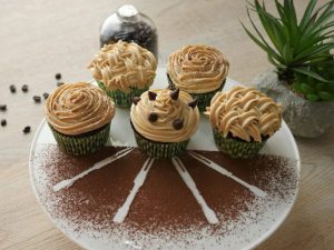 Put the cupcakes on a cooling rack to cool,when cooled,pipe the frosting over the cupcakes and decorate with coffee or chocolate chips.
