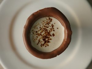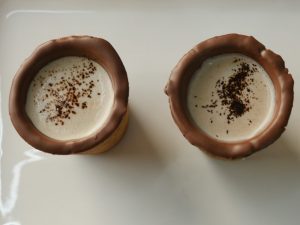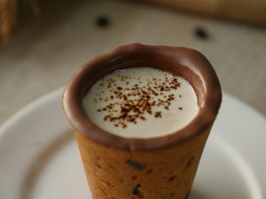 Melt cooking chocolate in microwave and pour the melted chocolate into the well of each cookie cups.
