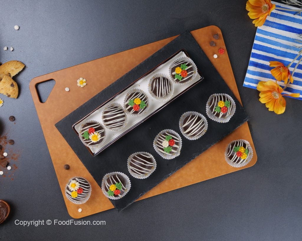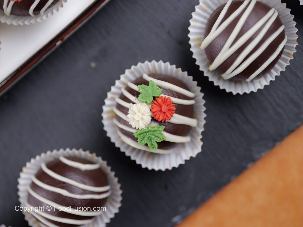 -White chocolate drizzle karein,chocolate flowers sa decorate ker lein aur set ho janay tak refrigerate ker lein (makes 12 truffles).
