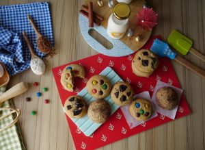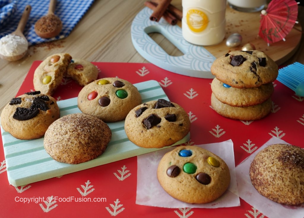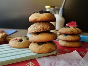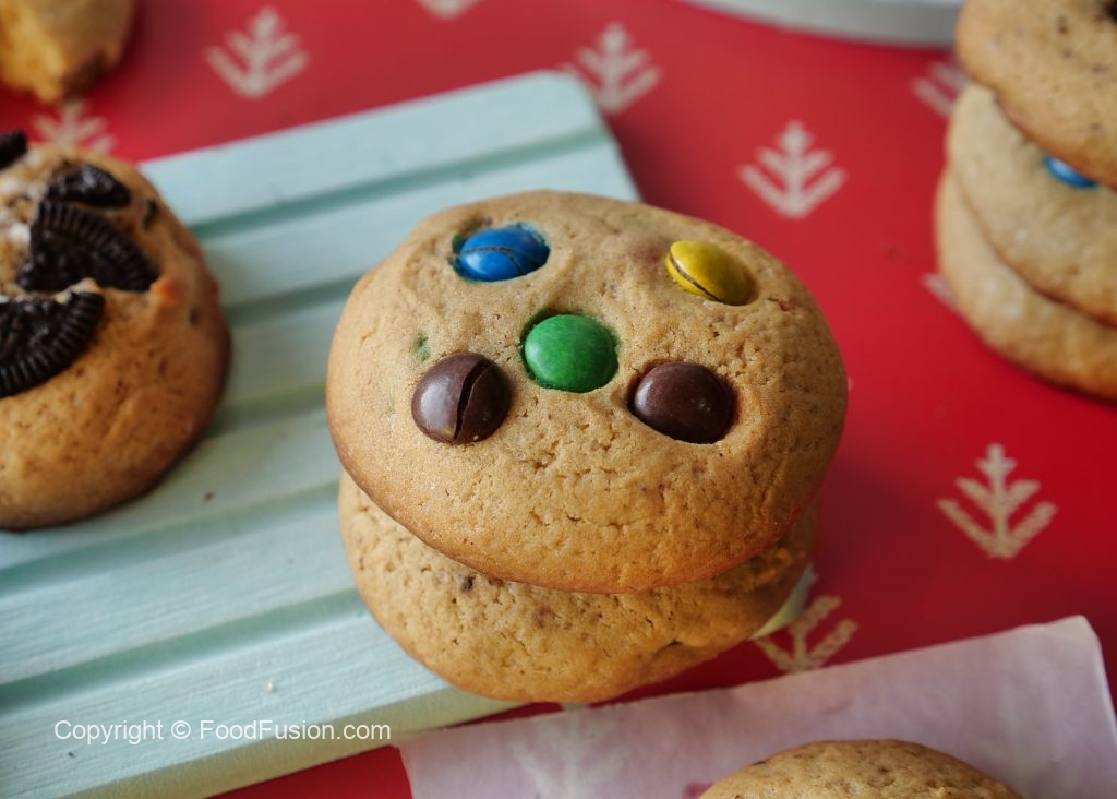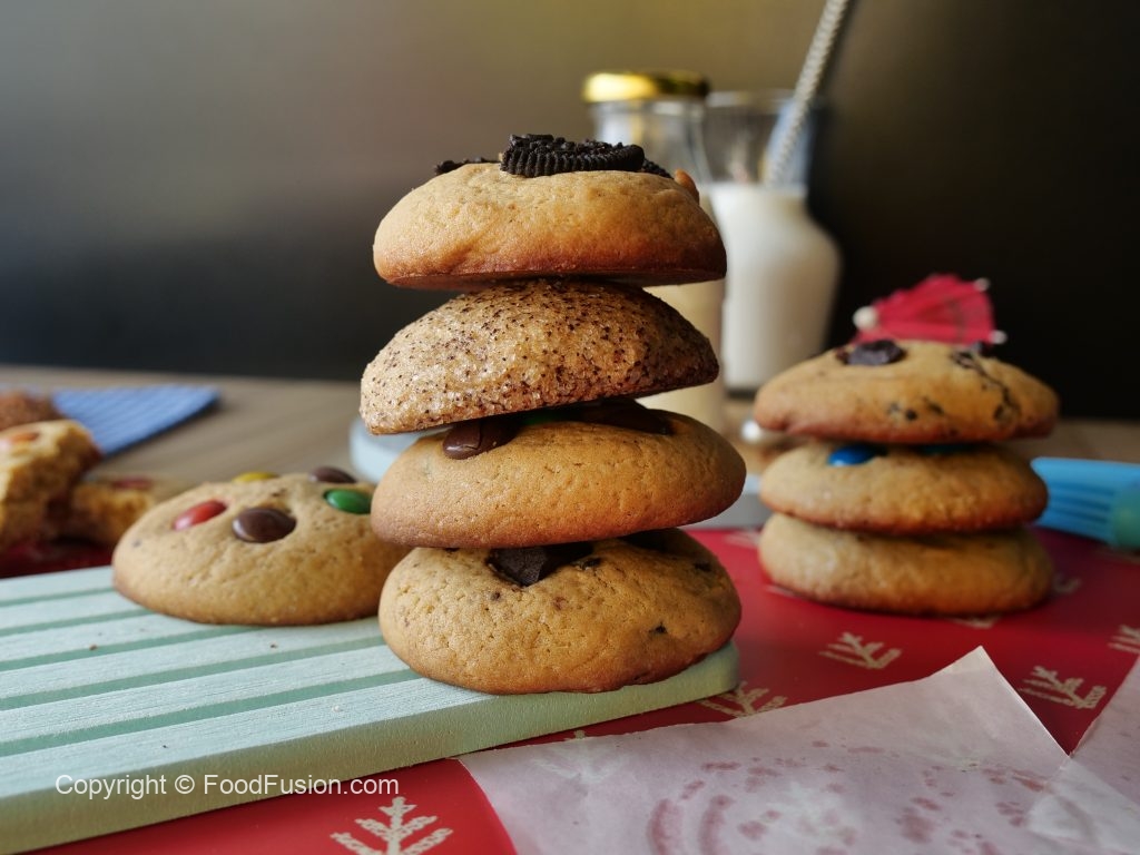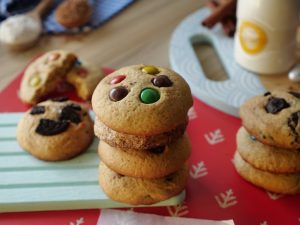 Lined baking tray with butter paper,place cookies and decorate with coffee,cinnamon & sugar mixture, oreo biscuits,m&m’s bounties,milk chocolate & press gently.