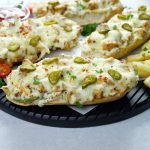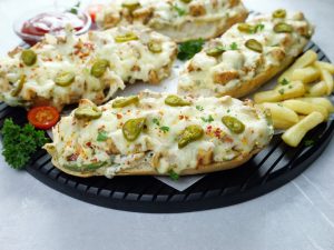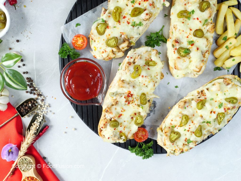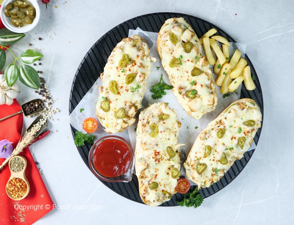 -Dinner roll/buns ki ek side per creamy veggies,tayyar chicken,cheddar cheese mozzarella cheese,lal mirch crushed & pickled jalapenos dal dein.