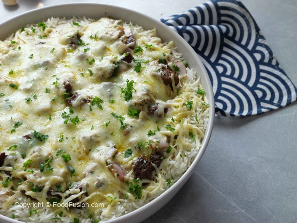 -In a serving dish,add boiled rice,steak bites,fresh parsley,spring onion,pour prepared white sauce, cheddar cheese & mozzarella cheese.