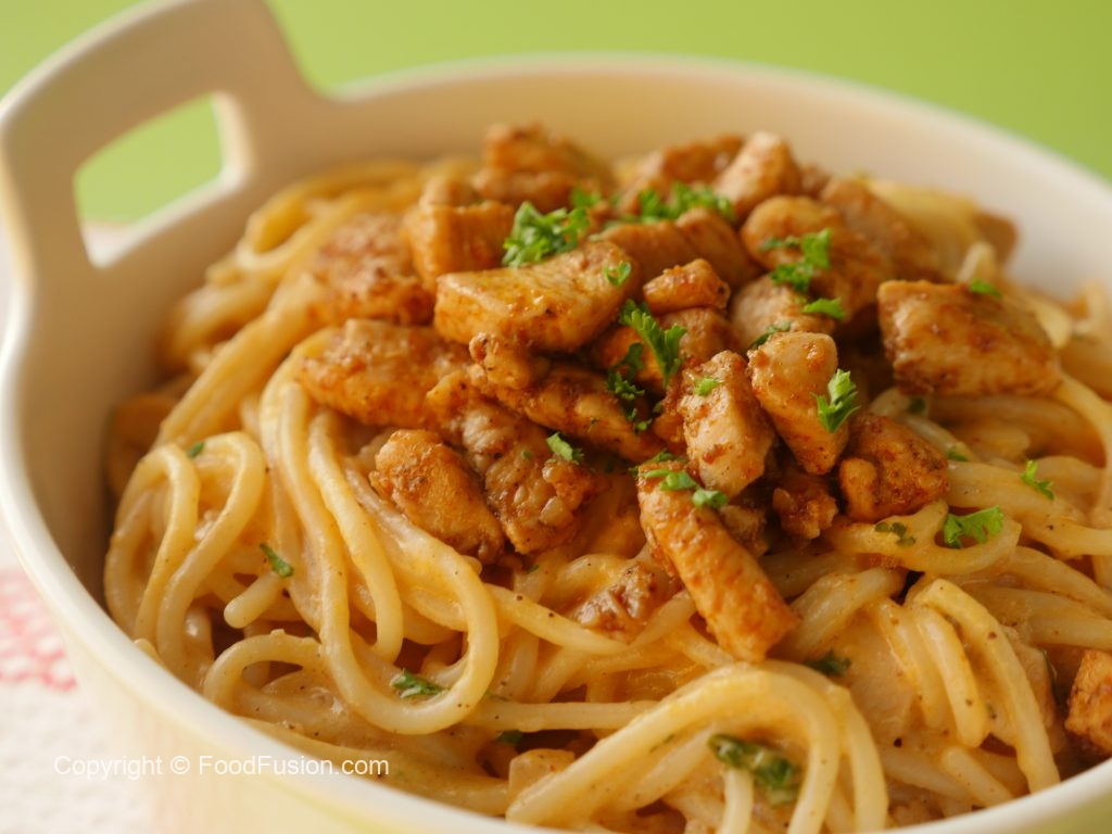 In serving dish,add creamy tomato spaghetti,cooked chicken,fresh parsley & serve!
