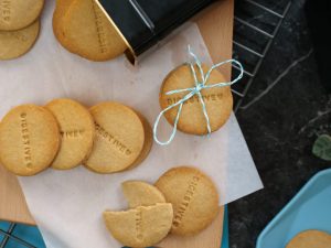 -Baking tary per butter paper laga lein aur cookies rakh ker cookie stamp ki madad sa stamp laga lein (makes 30 biscuits) aur 15 minutes klliya refrigerate ker lein.