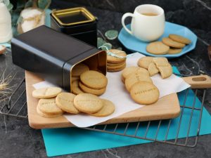 -Cookie cutter (2.25 inches) ki madad sa round shape mein cut ker lein (2 mm thick biscuits).