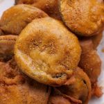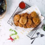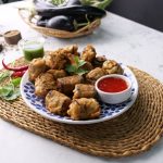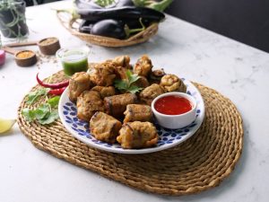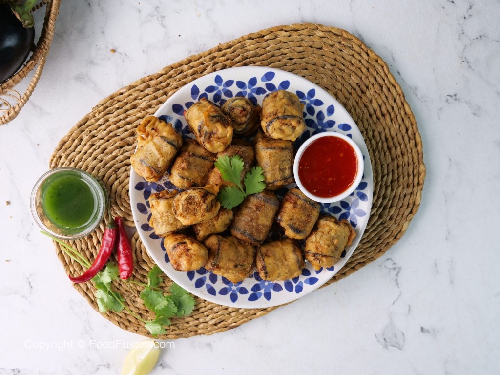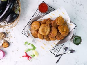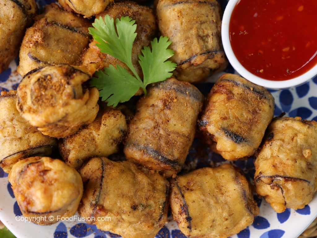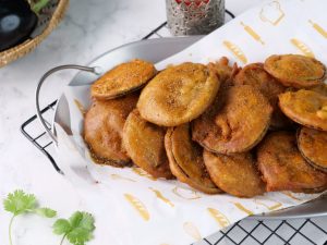 -Karahi mein cooking oil garam karein aur baingan slices ko pakora batter mein dip karein aur halki ancch per golden ho janay tak fry ker lein.