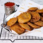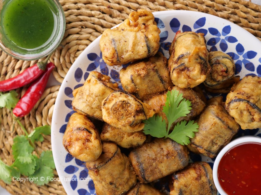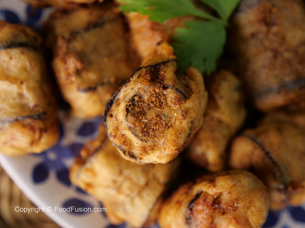 -In a wok,heat cooking oil,dip eggplant slices in pakora batter & fry on low flame until golden.