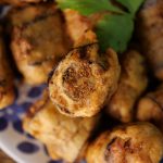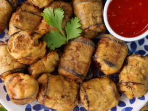-On a thin slice of eggplant,add prepared mince filling & roll up.