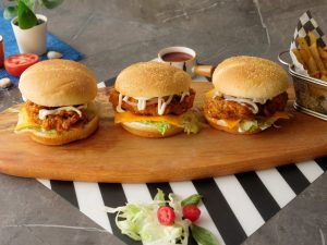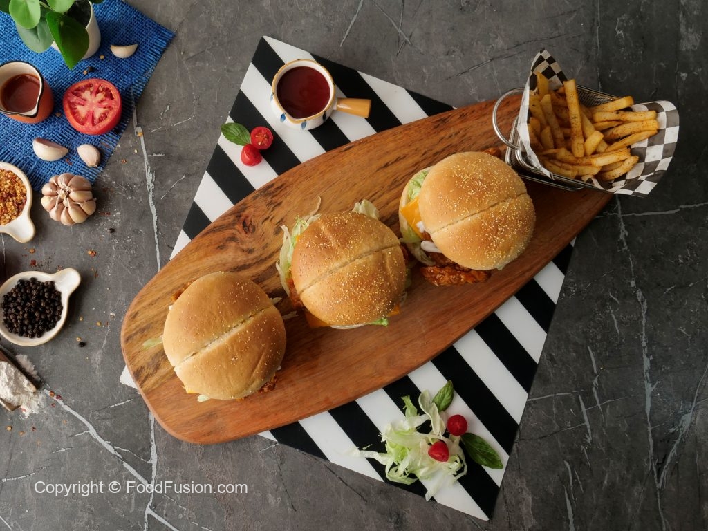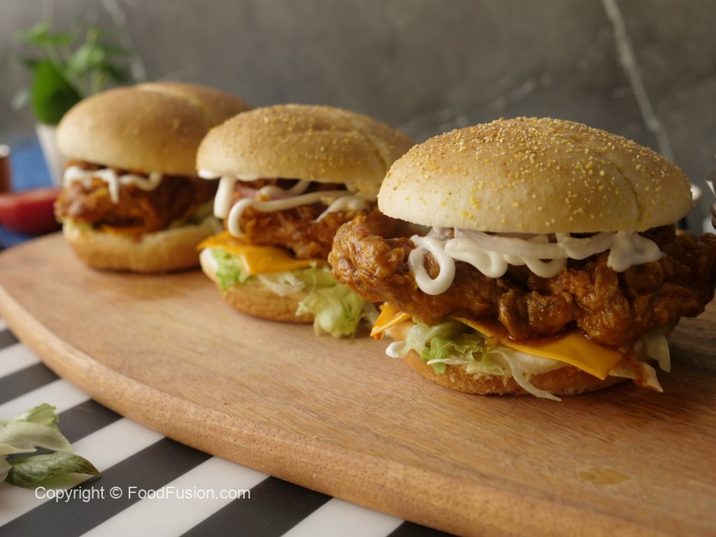 On burger bun,add mayonnaise,add iceberg,cheddar cheese slice,buffalo sauce coated chicken,onion rings,mayonnaise & top with another bun (makes 4).