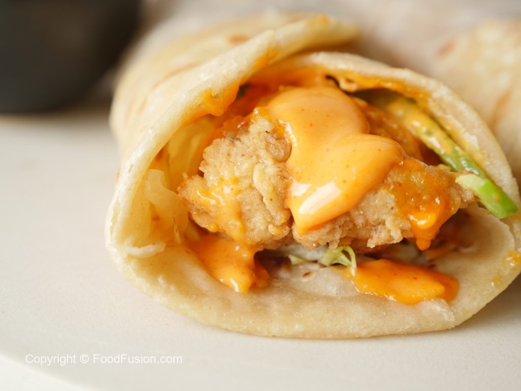 On paratha,add iceberg,crispy fried chicken,capsicum and drizzle prepared fusion spicy sauce and wrap with butter paper & serve (makes 5-6).