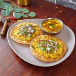 -On a fried pakwan, add prepared daal, spice mix, hari chutney, imli ki chutney, onion & garnish it with fresh coriander, & lemon wedges.
