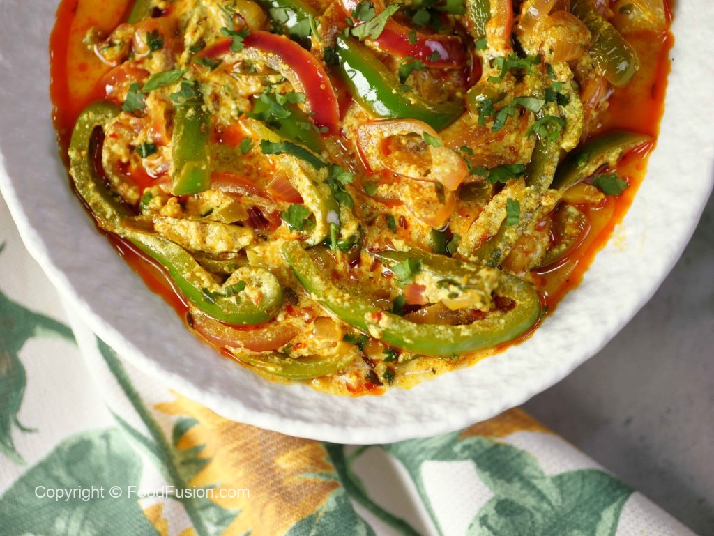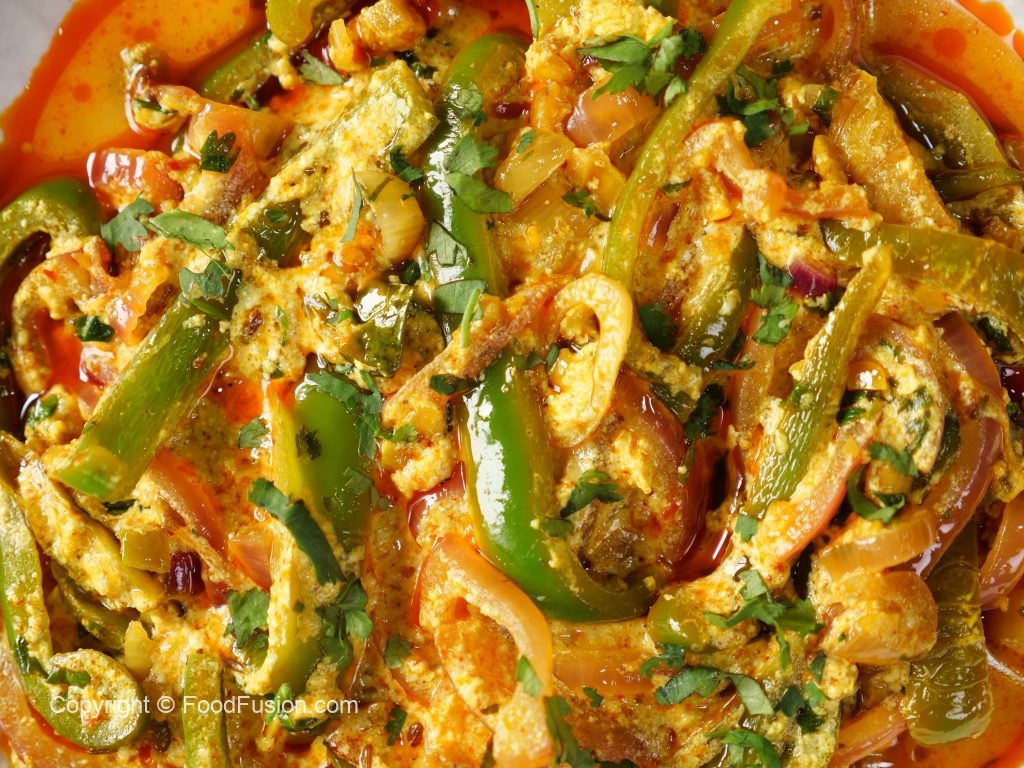 -Shimla mirch ke beej nikal kar julienne cut karein aur pyaz ko half-moon slices mein cut ker lein.
