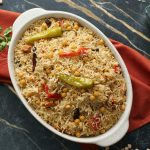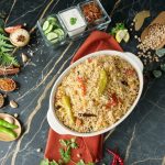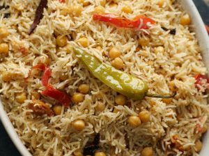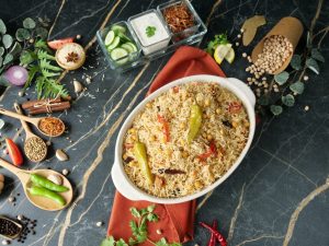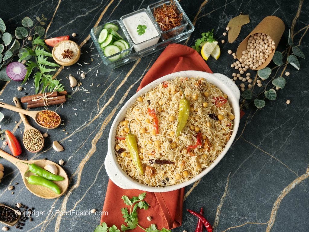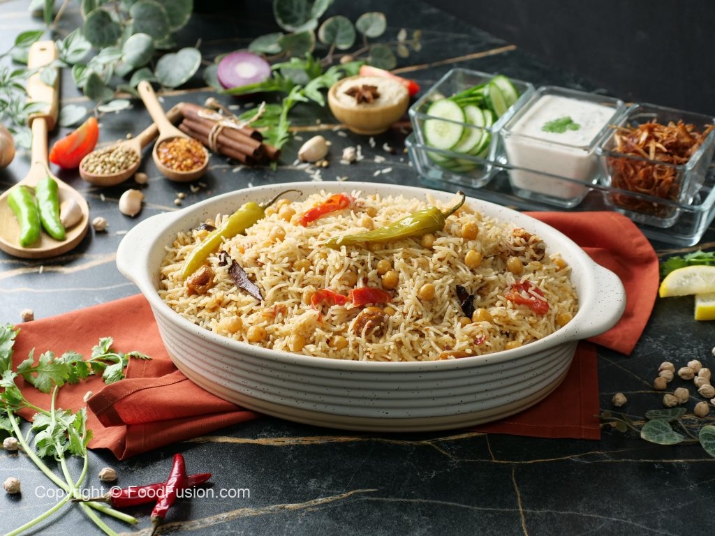 -Serve degi chana pulao with yogurt raita,salad & fried onion.