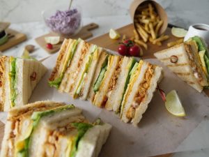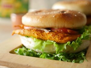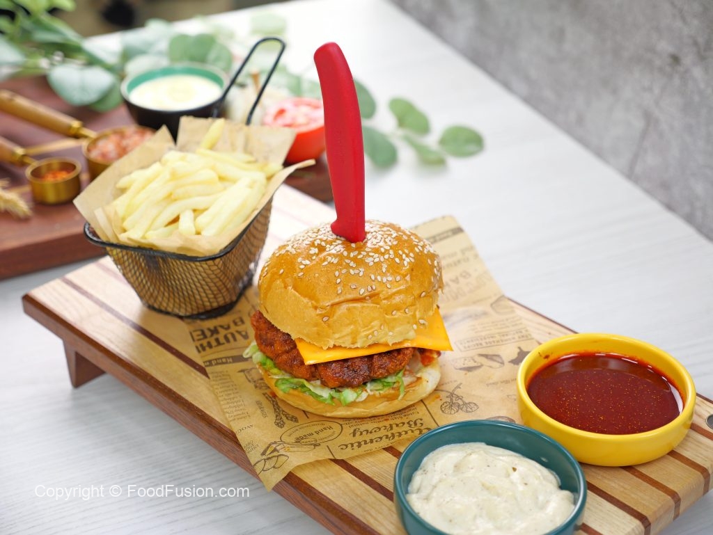 -On toasted bun,add & spread prepared mayo garlic sauce,iceberg lettuce,crispy fried chicken,apply magic spice oil,cheddar cheese slice,pickled cucumber,mayo garlic sauce & top with another bun (makes 5).