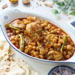 Now add reserved chickpea stock/ water,mix well & bring it to boil,cover & cook on low flame until chicken is tender & oil separates (8-10 minutes).