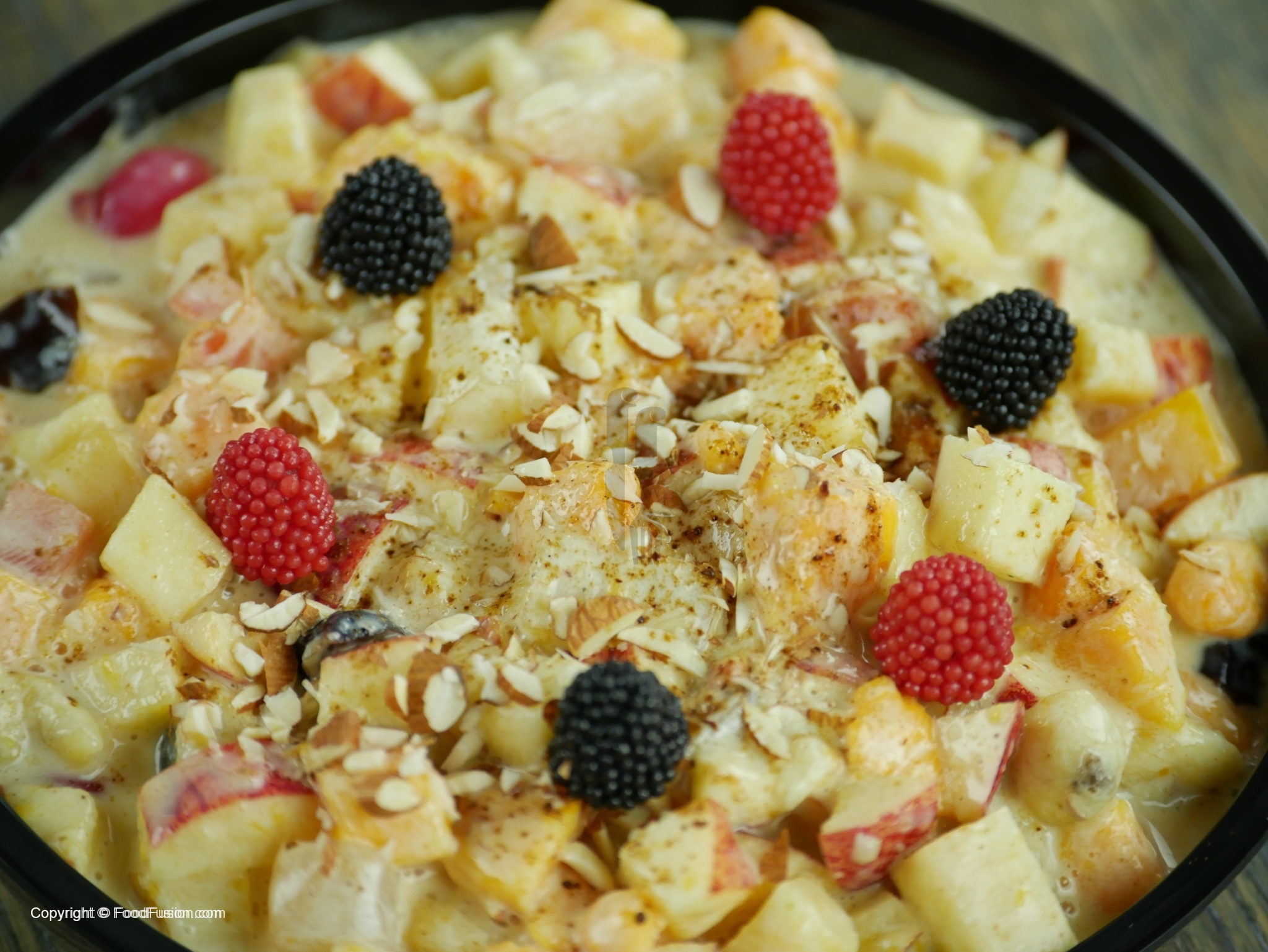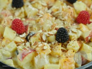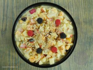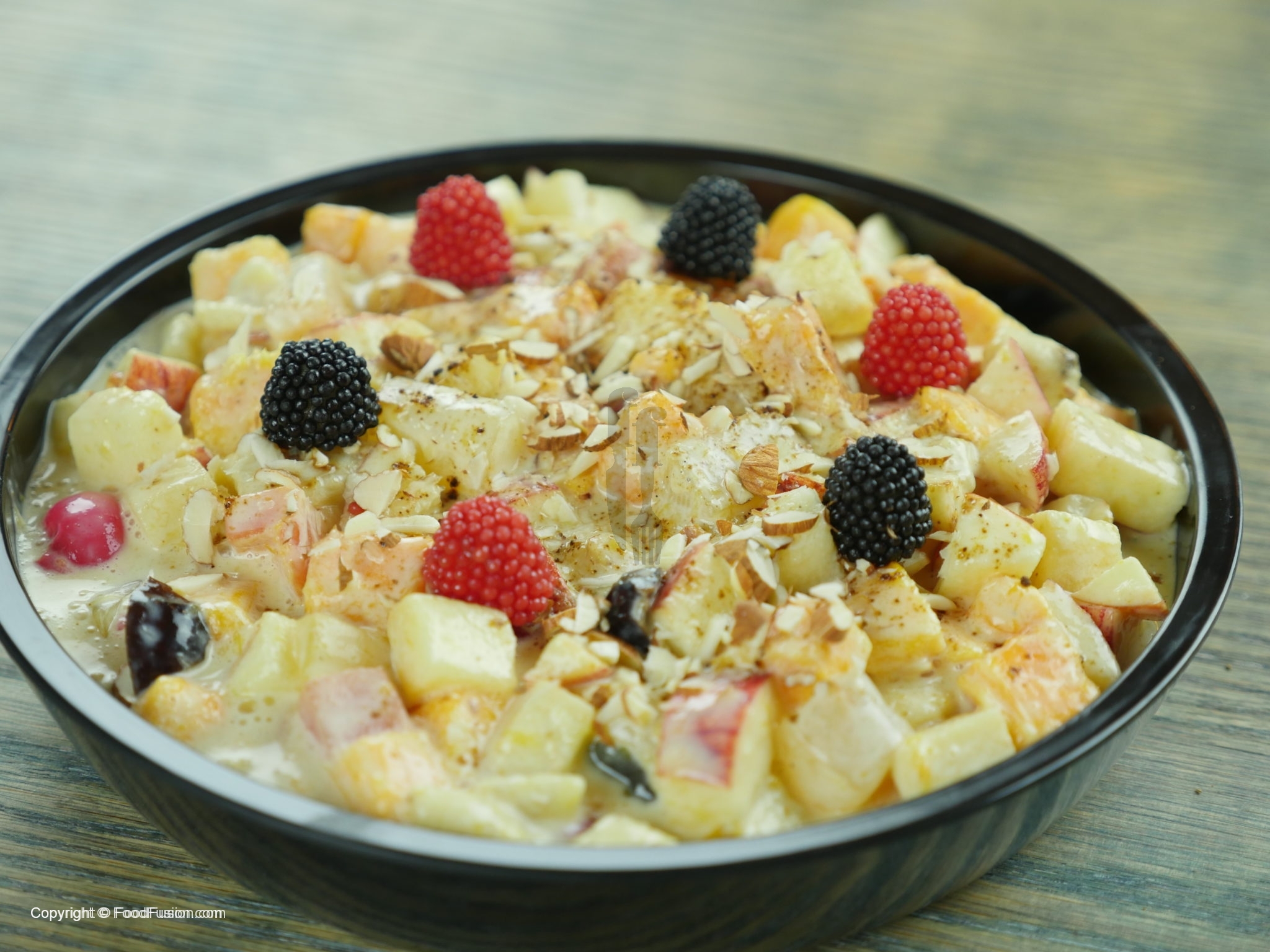 In bowl add apples (cubed), mangoes (cubed), banana (slices), dates, canned fruit, almonds (chopped) and chart masala, mix well.