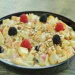 Dish out and sprinkle chart masala, almonds (chopped) and garnish with berries.