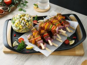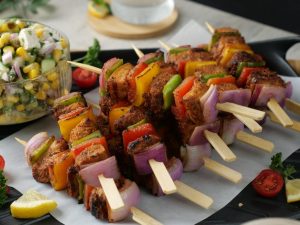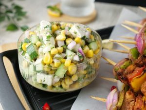 Fajita Skewers with Corn Feta salad