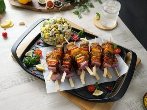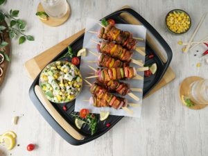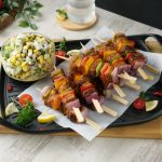 -Serve Fajita skewers with corn feta salad & 7Up!