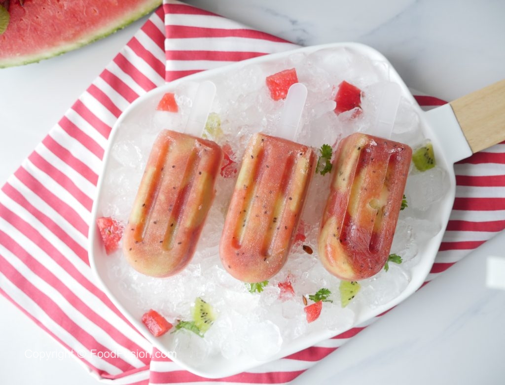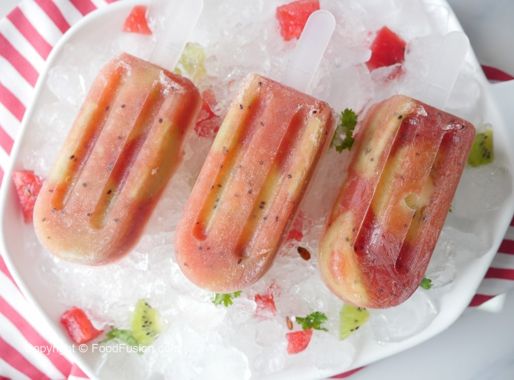 Ice pop molds mein kiwi slices rakh ker tayyar puree dal dein aur kiwi slices rakh dein aur solid hunay tak freeze ker lein (8 hours).