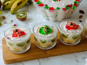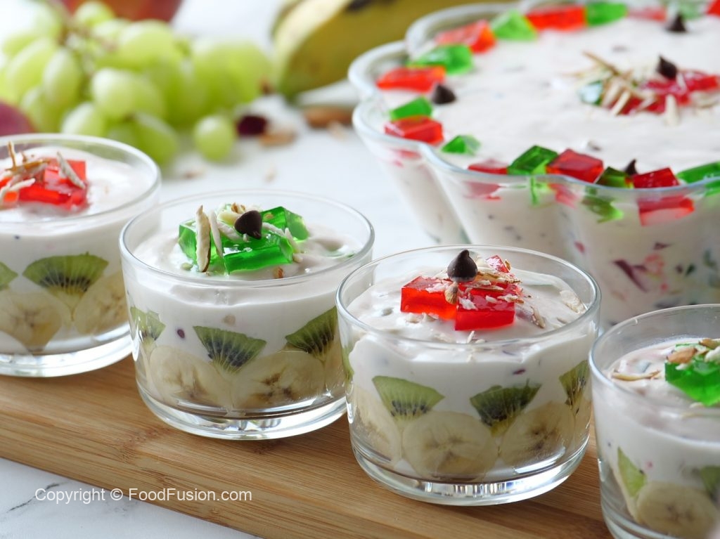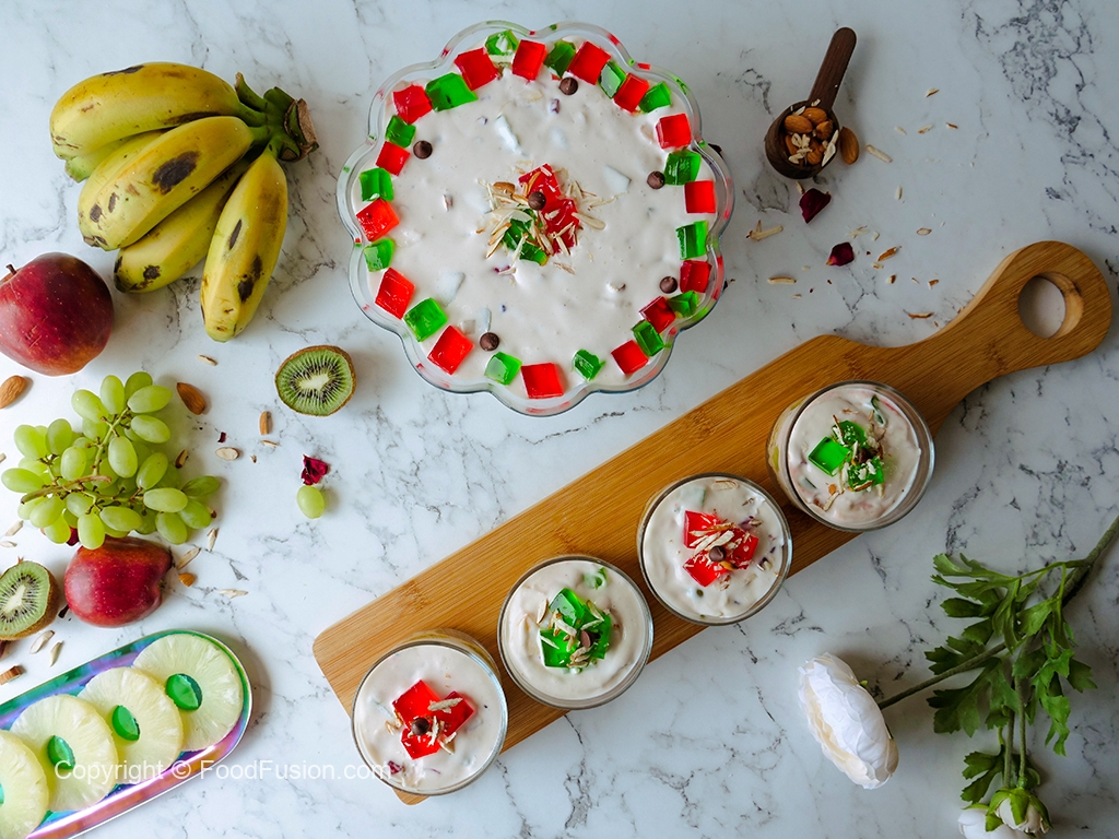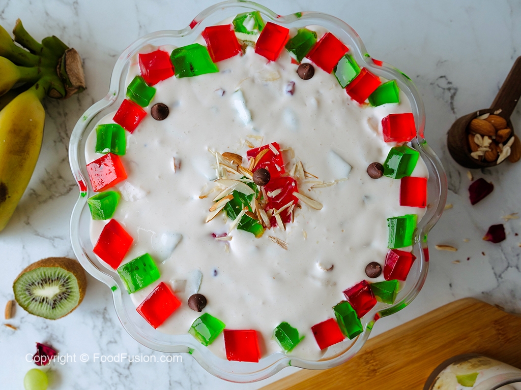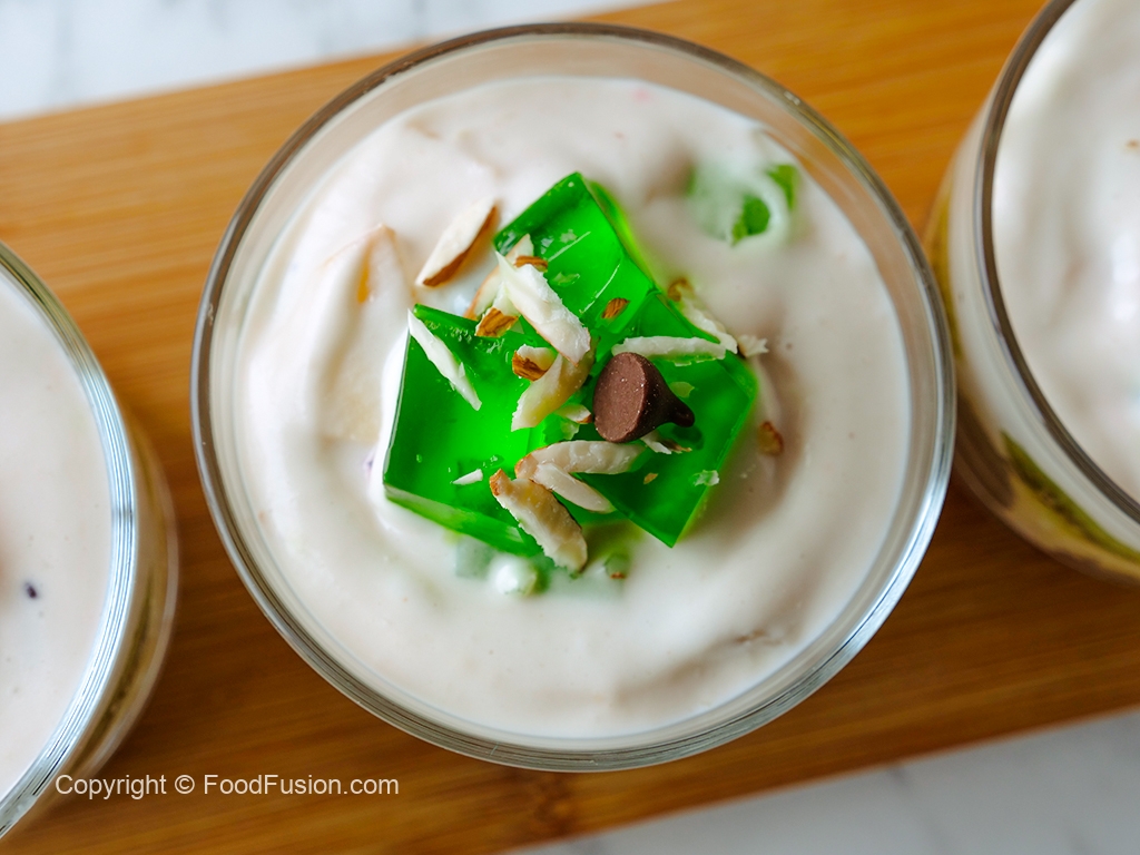 Red & green jelly dal ker mix karein (serving sa pehlay jelly shamil karein).
