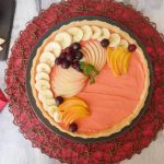 On tart base,add & spread the prepared custard and garnish with banana,apple,peaches & cherries.