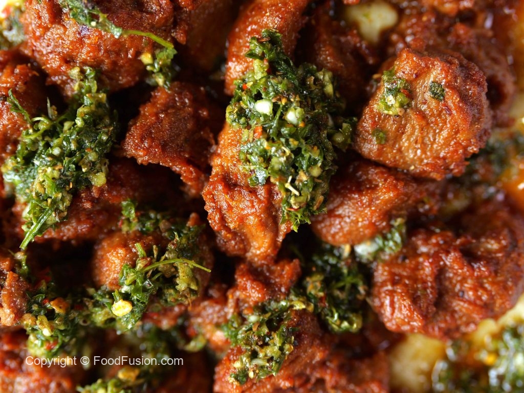 -In a serving dish,add mashed potato,chimichurri sauce,fry beef boti,chimichurri sauce,chaat masala & serve!