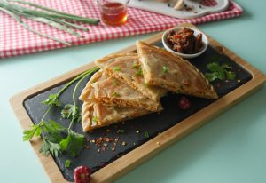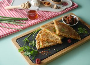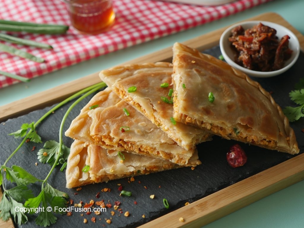 Roll out another dough with the help of rolling pin,add & spread prepared chicken filling,green onion leaves,mozzarella cheese,place another rolled dough,press & seal the edges (makes 6).