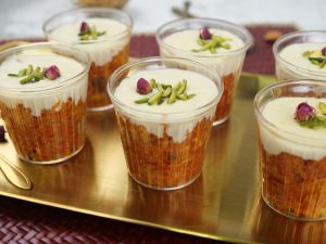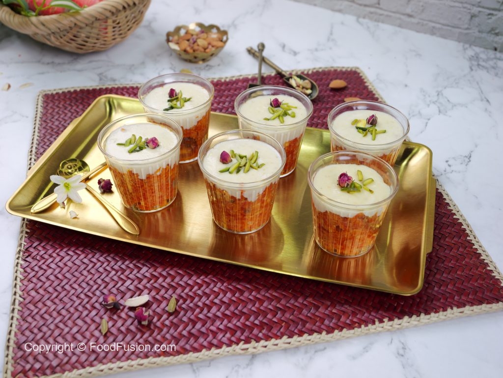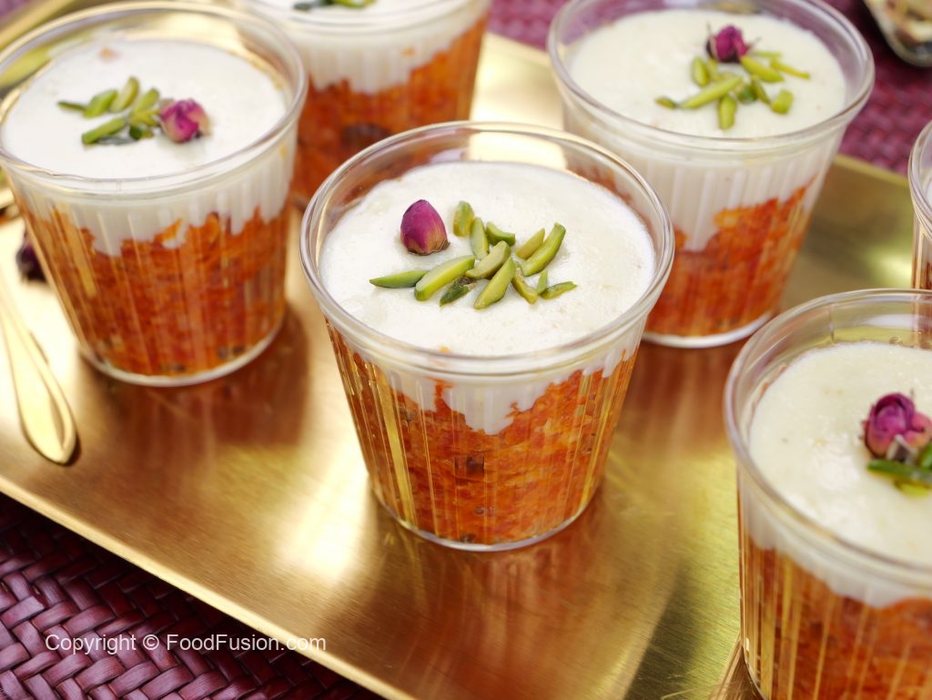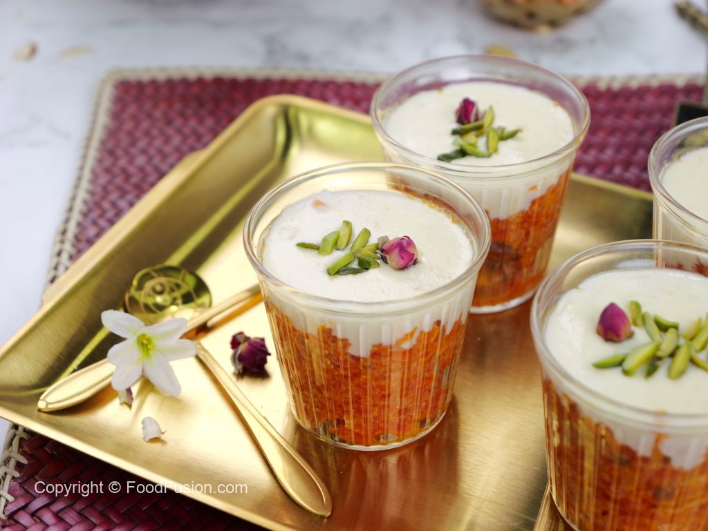 -Serving glass mein tayyar gajar halwa aur creamy khoya dal dein,pista aur dried rose sa garnish ker ka serve!