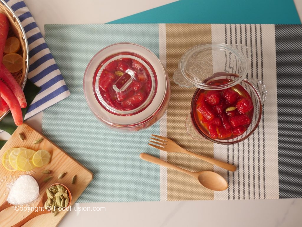 Rinse and peel carrots (While making carrot murabba, use tender juicy carrots and not hard or fibrous carrots and also go for thin carrots as they take less time to cook).