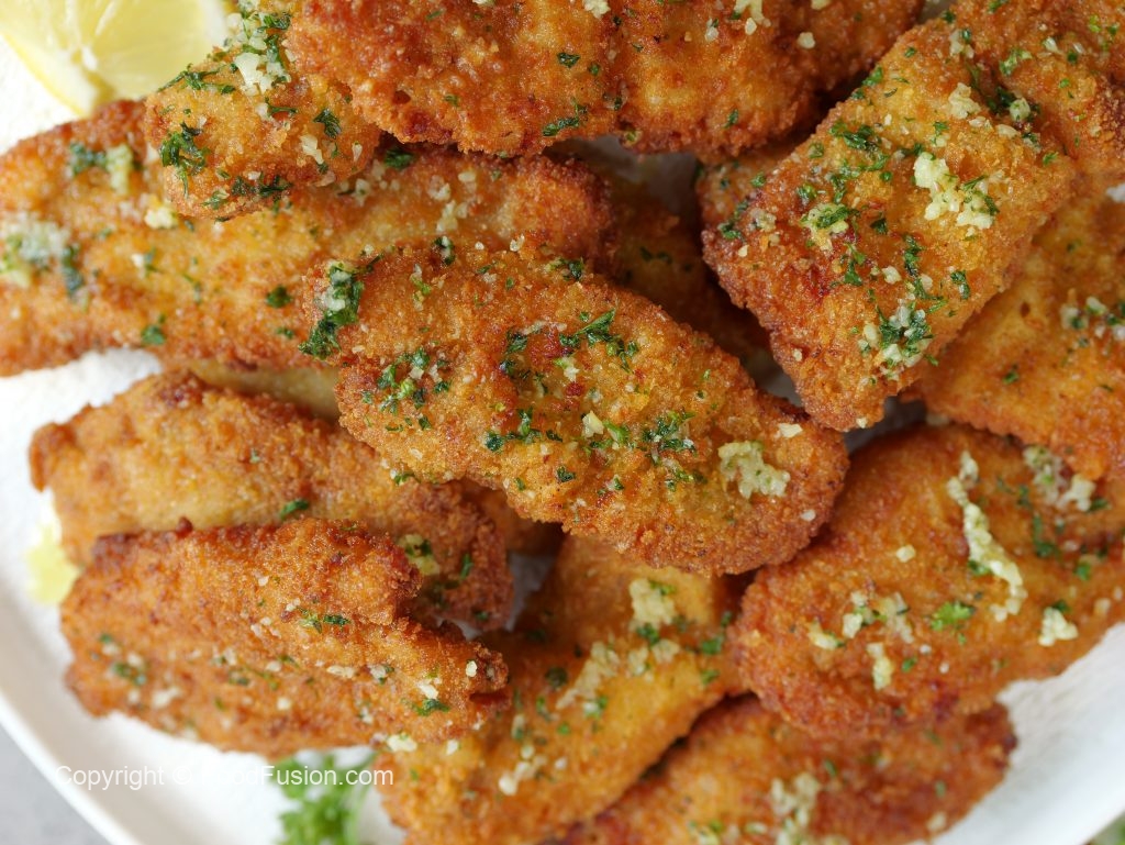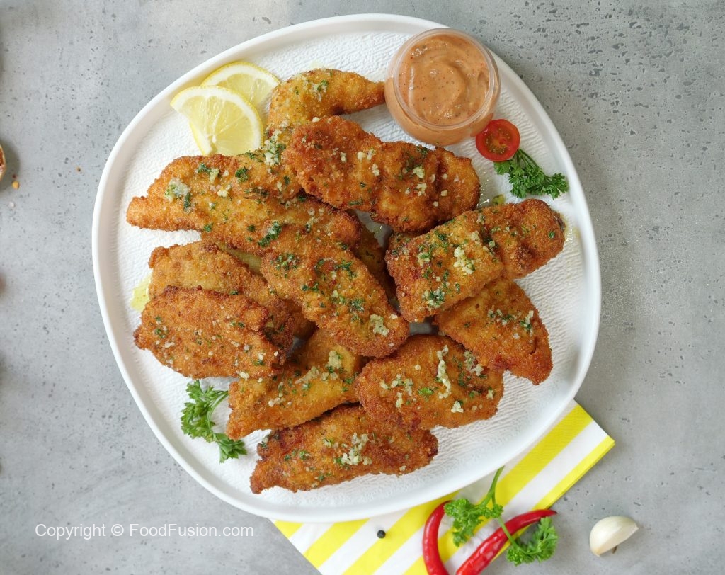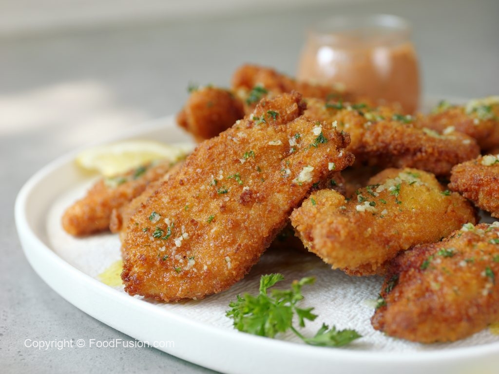 -Ab marinated strips ko maida mein coat karein phir pheetay hoya anday mein dip ker ka breadcrumbs sa coat ker lein.