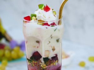 In grinder,add grapes,water and grind well then strain & set aside juice for later use and also reserve skin & flesh for later use.