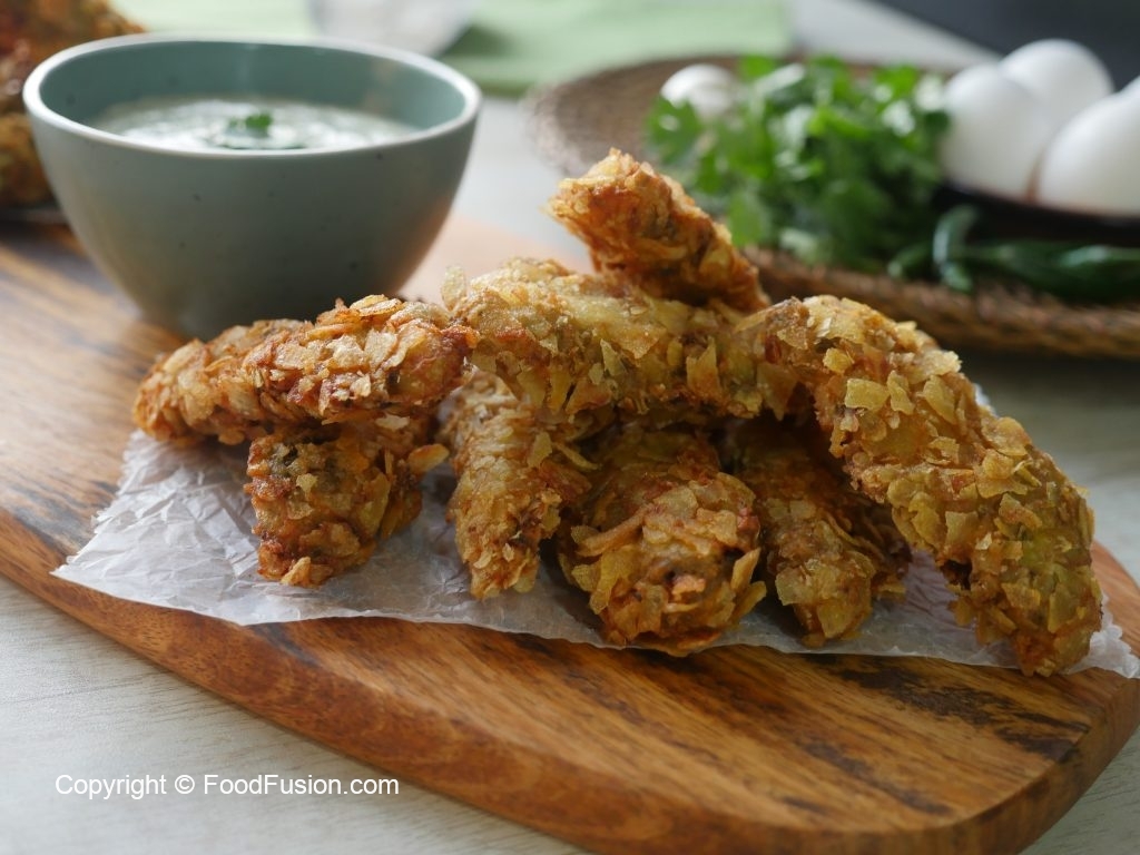 Now coat marinated chicken strips in all-purpose flour then dip into beaten eggs and coat with crush chips.