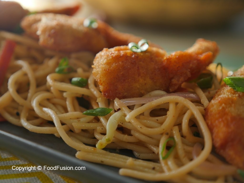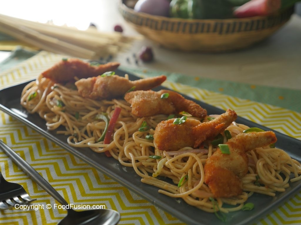 Serve Hakka noodles with fried shrimps and sprinkle spring onion green for garnishing.