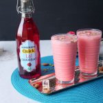 -In a serving glass,add ice cubes,milk,lal sharbat & stir.