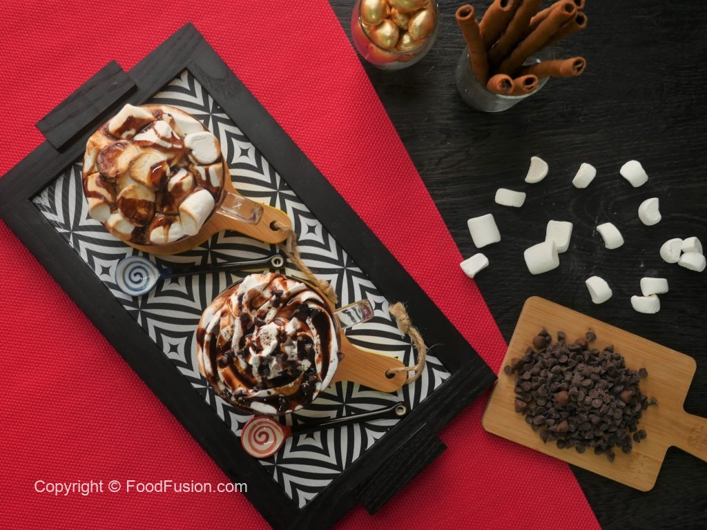 Serving cup mein caramel hot chocolate aur marshmallows dal dein aur blow torch ki madad sa burn ker lein.