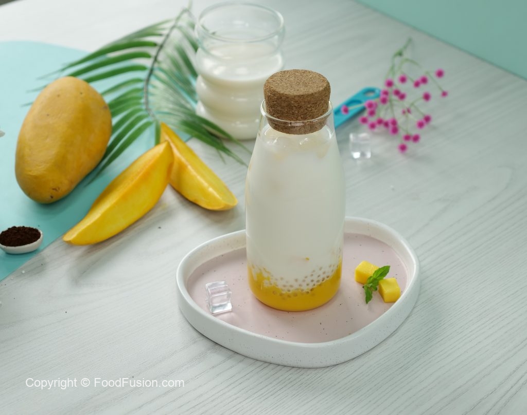 -In a glass bottle,add prepared mango puree (2-3 tbs),boiled tapioca sago (2 tbs),condensed milk, mango chunks,ice cubes,milk,stir well & serve!