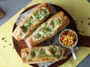 -On 11-inch pizza pan,place rolled dough,add mozzarella sticks on the side of rolled dough,fold the sides of dough & seal properly then prick with the help of fork.