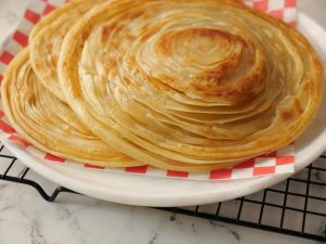 -Add desi ghee,spread evenly & dust dry flour,cut into strips the help of cutter & roll stirp like a swiss roll (stretch in between).