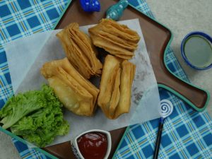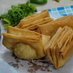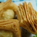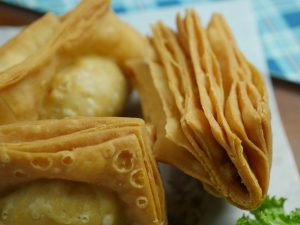 Add 1 tbs of prepared potato filling in the center,apply water,fold the sides of the dough over the filling and gently press the edges together to seal the suffering insides (makes 12).