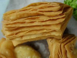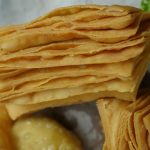 Apply flour paste & dust dry flour over the top layer and roll out with help of rolling pin,fold around the rolling pin then cut from the center and roll out in rectangular shape with help of rolling pin.