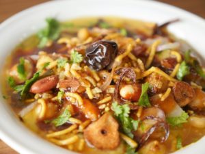 In serving plate,add chickpeas,potatoes,chaat masala,kadhi,khatti meethi chutney,onion,lemon juice, fresh coriander,green chilies,chaat masala,mix nimco,khatti meethi chutney & serve.