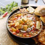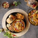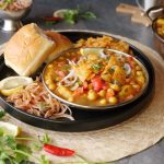 -On a serving plate,add khathiawari cholay,prepared hari chutney,tomato,chaat masala,red chilli crushed,onion,papri,fresh coriander & serve with pav buns!