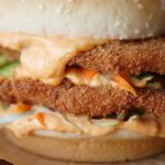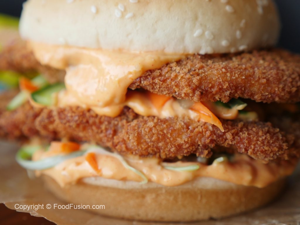 On burger bun add and spread prepared sriracha mayo sauce, pickled vegetables, Katsu fried chicken, sriracha mayo sauce, pickled vegetables, katsu fried chicken, sriracha mayo sauce and cover with burger bun.
