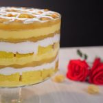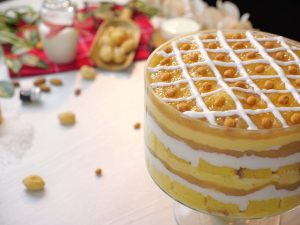 -In a serving dish, add a layer of prepared custard, cake sponge, sugar syrup, whipped cream, pistachios, almonds, prepared apricot compote, repeat layers again.